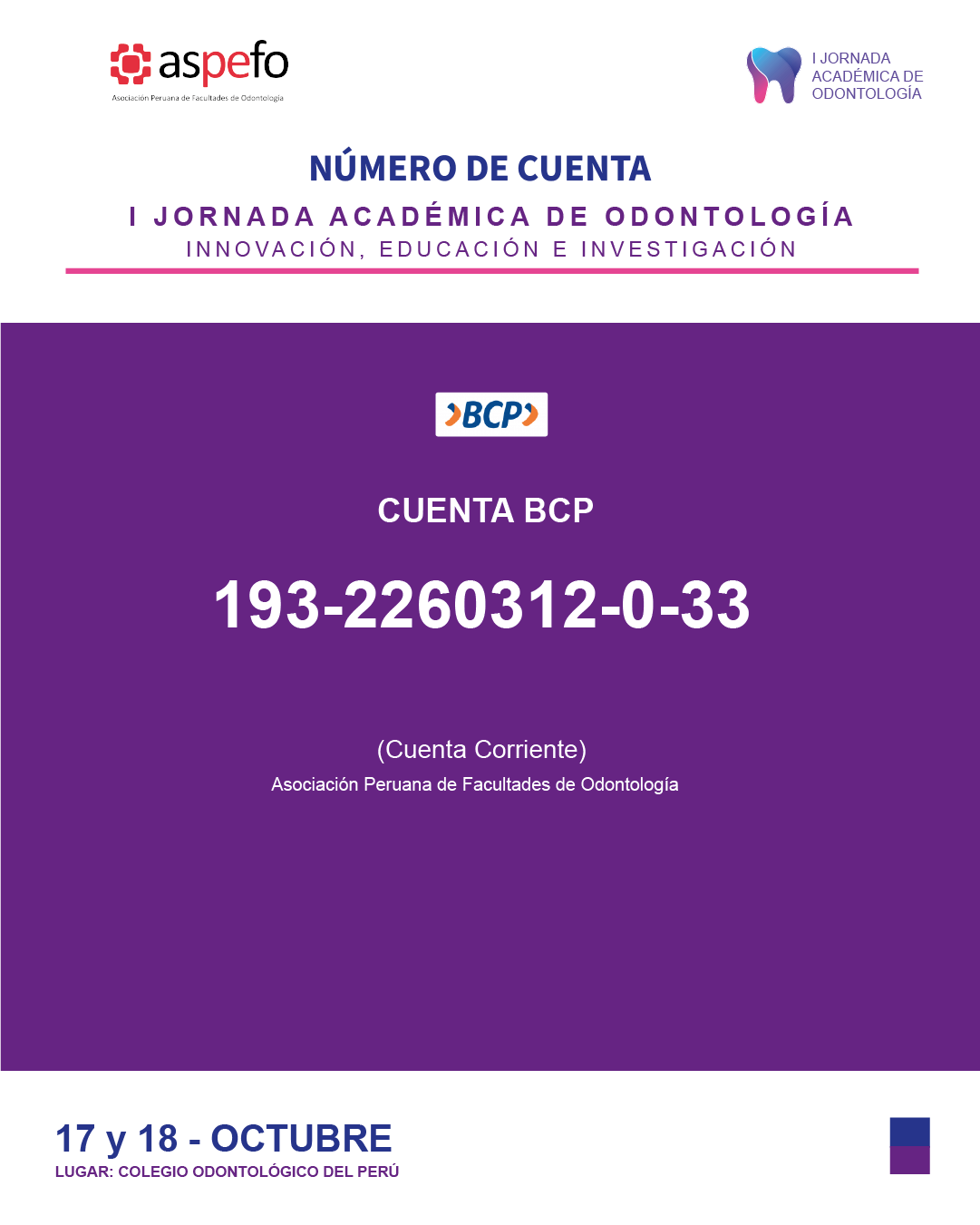 La Asociación Peruana de Facultades de Odontología (ASPEFO) se complace en invitar a toda la comunidad odontológica a la I Jornada Académica de Odontología: Innovación, Educación e Investigación, un evento diseñado para explorar los avances más recientes y las tendencias futuras de nuestra profesión.