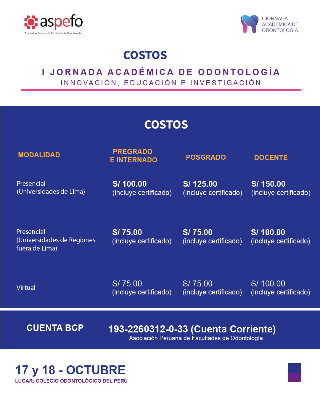 - Lugar: Colegio Odontológico del Perú